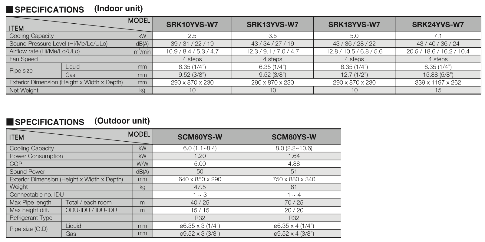 Rated cooling capacity range from 6.0kw to 8.0kw with a max cooling capacity range of up to 9.0kw and 11.9kw respectively.. Applicable for system 1 or 2 or 3 installation. Connectible to indoor SRK-YVS and SRK-YYS series